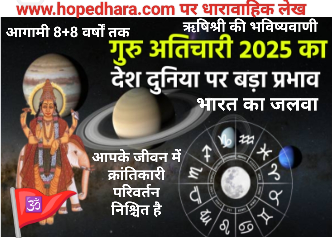 - ज्योतिषीय गणना के अनुसार, यह अतिचारी-गति लगभग 8 वर्षों के लिए मई 2025 से लेकर 2032 (कहीं 2033 तक) रहेगी। इसके बाद भी 2 वर्ष के अंतराल के बाद गुरु फिर से 8 वर्षों के लिए अतिचारी होंगे।
